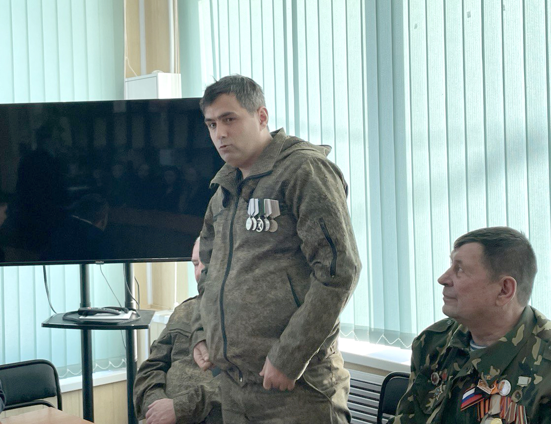 Андрей Фадеев, гость из посёлка Юдинка, в 2022 году добровольцем ушёл в зону Специальной военной операции. Сейчас вернулся к мирной жизни. Вместе с супругой в составе группы волонтёров плетёт маскировочные сети. Рядом с ним сидел участник спецоперации, житель Асекеево Ахмад Гатиятов. Он выразил сожаление, что возрастные ограничения не позволяют ему и дальше быть в строю, ведь ему 67 лет.